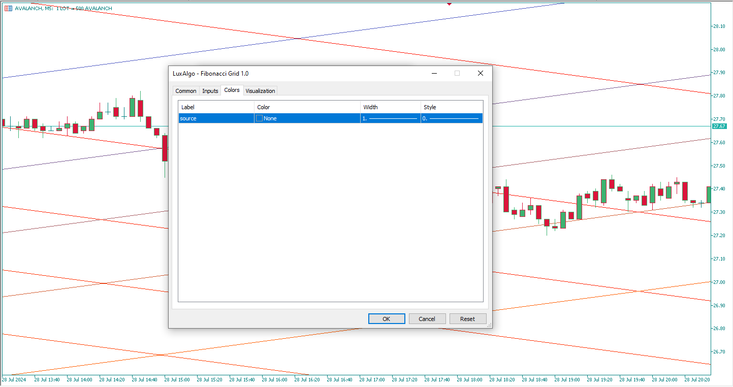 منبع (Source): این پارامتر مشخص میکند که کدام دادهها برای رسم شبکه مورد استفاده قرار بگیرند. معمولاً از قیمت بسته شدن کندلها استفاده میشود تا بهترین نقاط برای ترسیم خطوط فیبوناچی بدست آید.