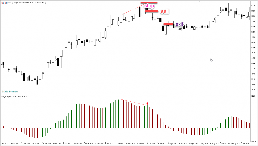 سیگنال فروش در اندیکاتور Awesome Oscillator Divergence