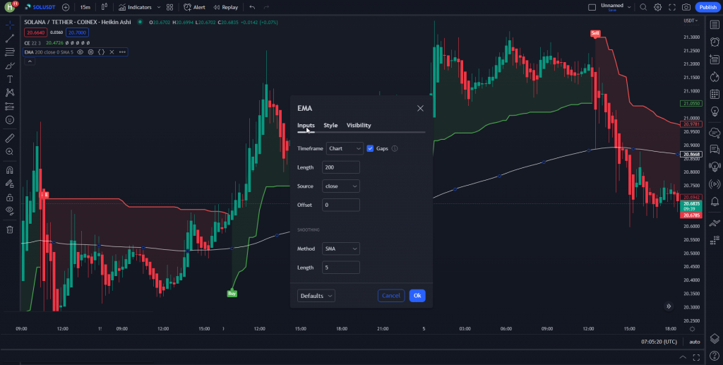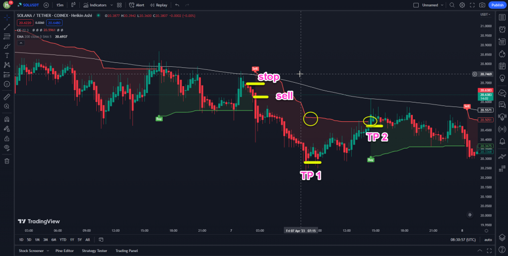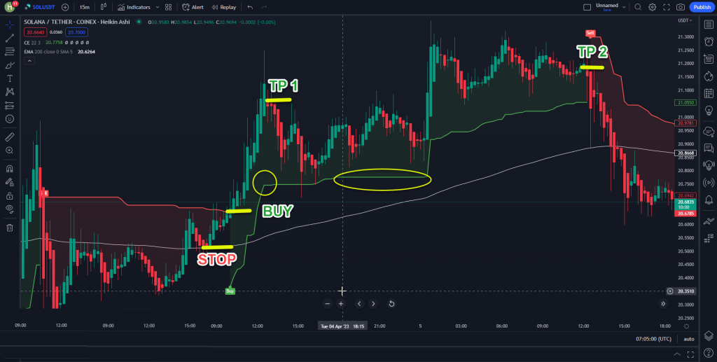 هرگاه کندل ها بالای میانگین با دوره 200 بودند و سپس خط اندیکاتور Chandelier Exit سبز رنگ شد و لیبل خرید ظاهر شد ما می توانیم یک معامله خرید باز کنیم و حد ضرر را کمی پایین تر از نقطه ورود خود قرار دهیم.