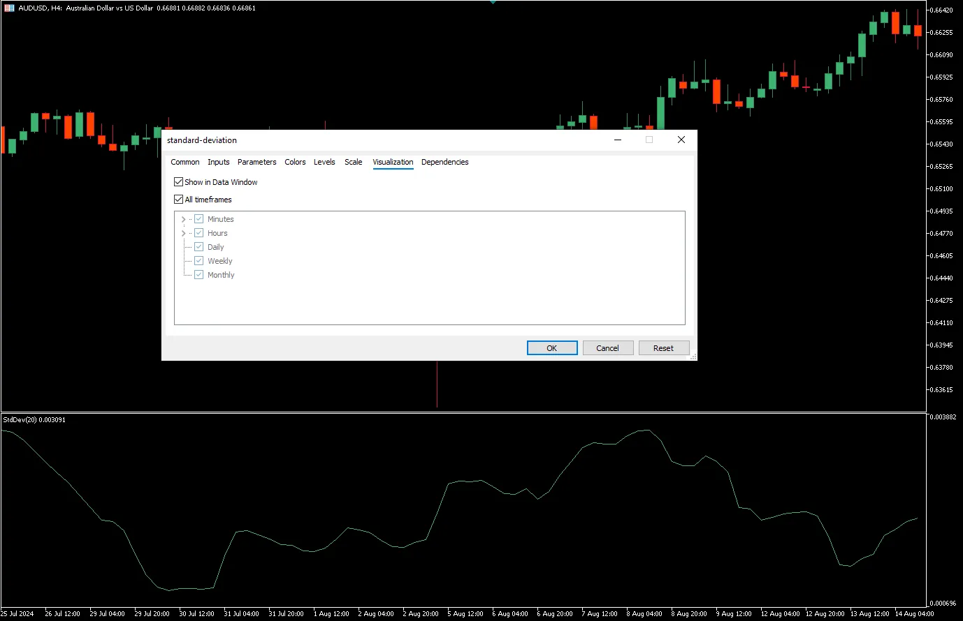 اندیکاتور Standard Deviation در پنجره دادهها (Data Window) ظاهر میشود و مانند هر اسیلاتور دیگر، دارای شرایط خرید بیش از حد (Overbought) و فروش بیش از حد (Oversold) است.این اندیکاتور یک خط بدون محدودیت یا مقیاس مشخص رسم میکند و این خط میتواند برای ایجاد سیگنالهای خرید و فروش استفاده شود. نکته مهم این است که اندیکاتور میتواند در هر بازه زمانی (Timeframe) مورد استفاده قرار گیرد، اما دقت آن در تایمفریمهای بالاتر بیشتر است.اندیکاتور Standard Deviation بر اساس یک روش آماری شناخته شده به نام انحراف معیار ساخته شده است و نوسانات قیمت را نسبت به میانگین متحرک ساده اندازهگیری میکند.