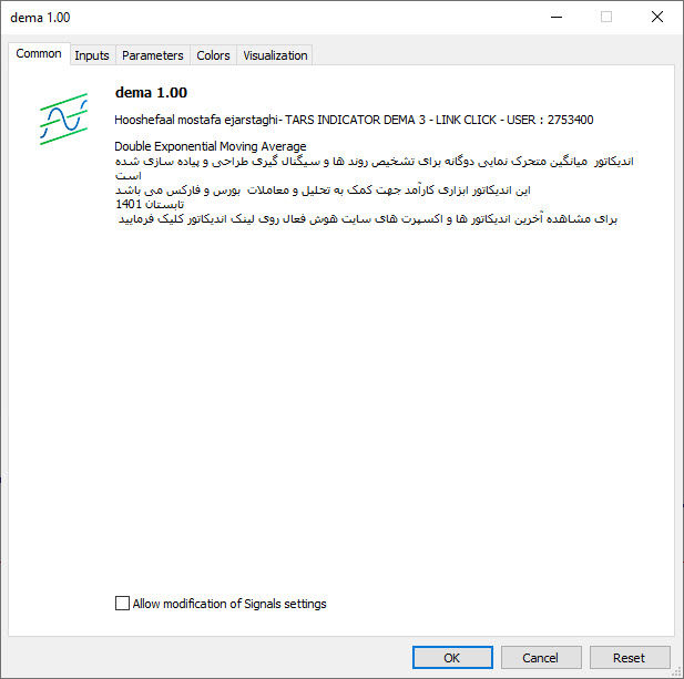 در سربرگ Common توضیحایت در ارتباط با اندیکاتور وجود دارد و ضمنا لینک دسترسی به سایت هوش فعال نیز قرار دارد تا افراد بتوانند با کلیک بر روی ان از جدیدترین اندیکاتور های منتشر شده آگاهی پیدا کنند.