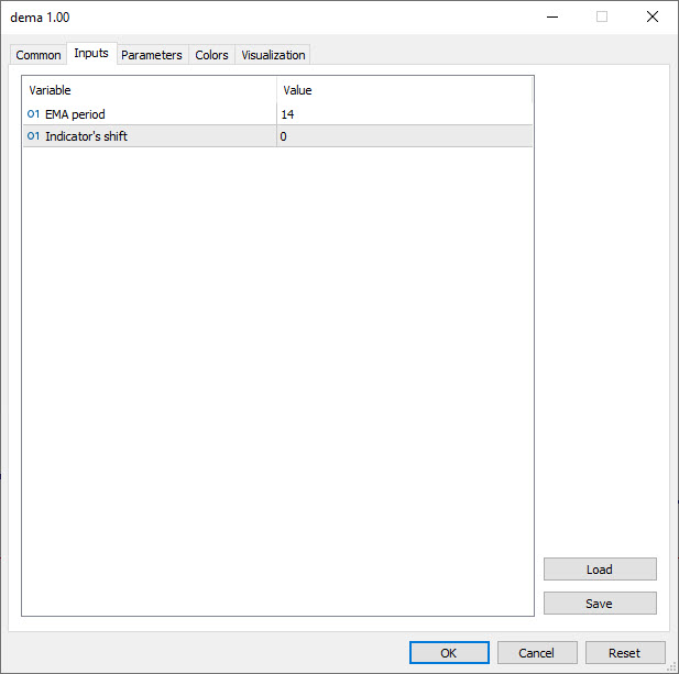 در سربرگ input ورودی های اندیکاتور DEMA وجود دارد که شما می توانید با توجه به استراتژی خود آن ها را تغییر دهید.
