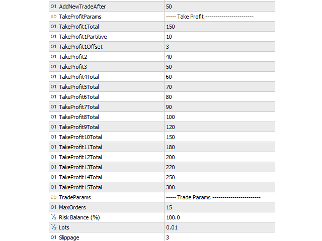 TakeProfit1Total: مجموع TP به پیپ برای اولین موقعیت.TakeProfit2/3: TP جداگانه برای موقعیتهای دوم و سوم.