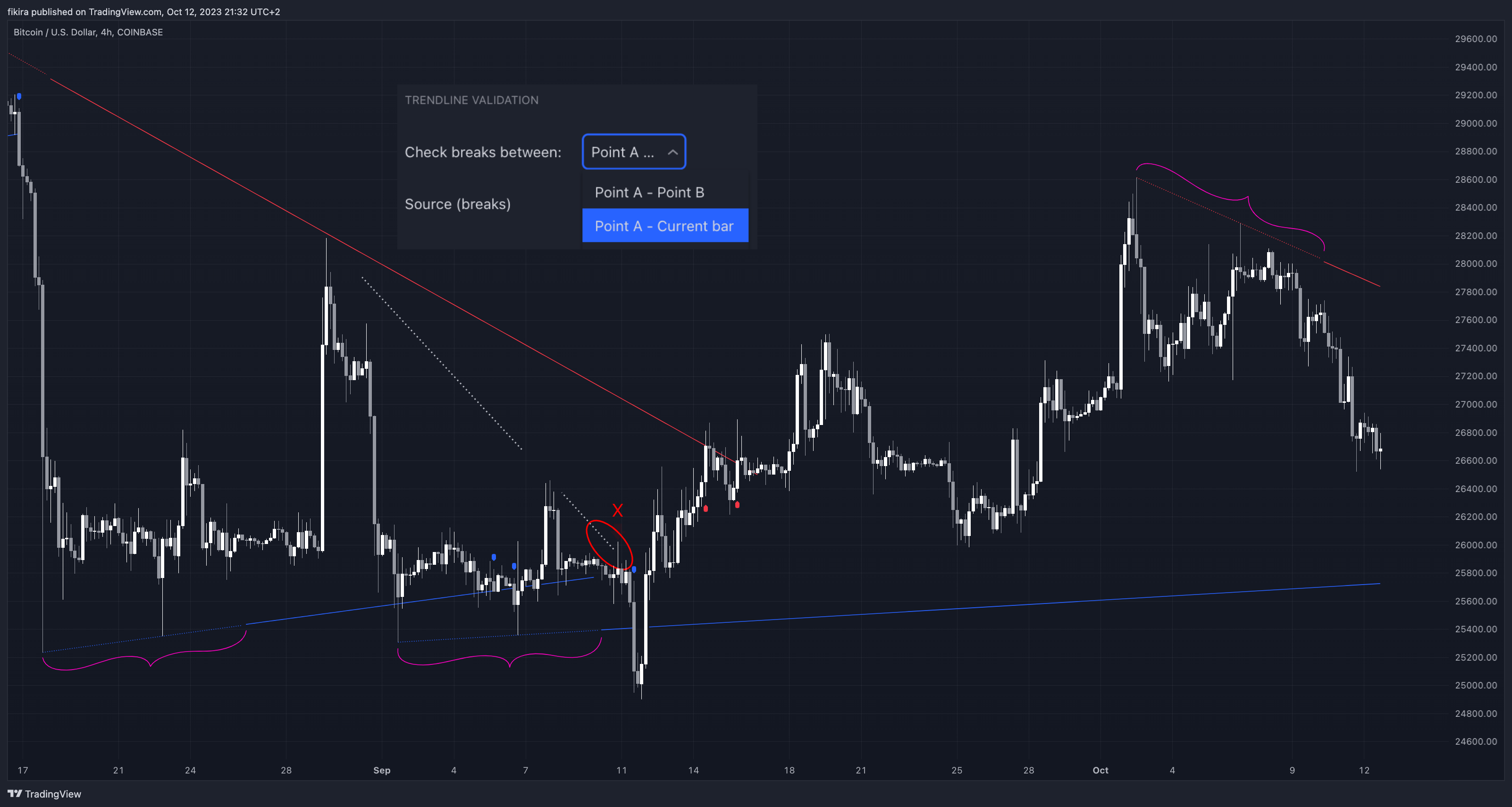 پس از تأیید اینکه یک خط روند میتواند رسم شود، این اسکریپت امکان فیلتر کردن شکستها در آن خط را فراهم میکند. این تنظیم به شما امکان میدهد گزینههای زیر را انتخاب کنید: