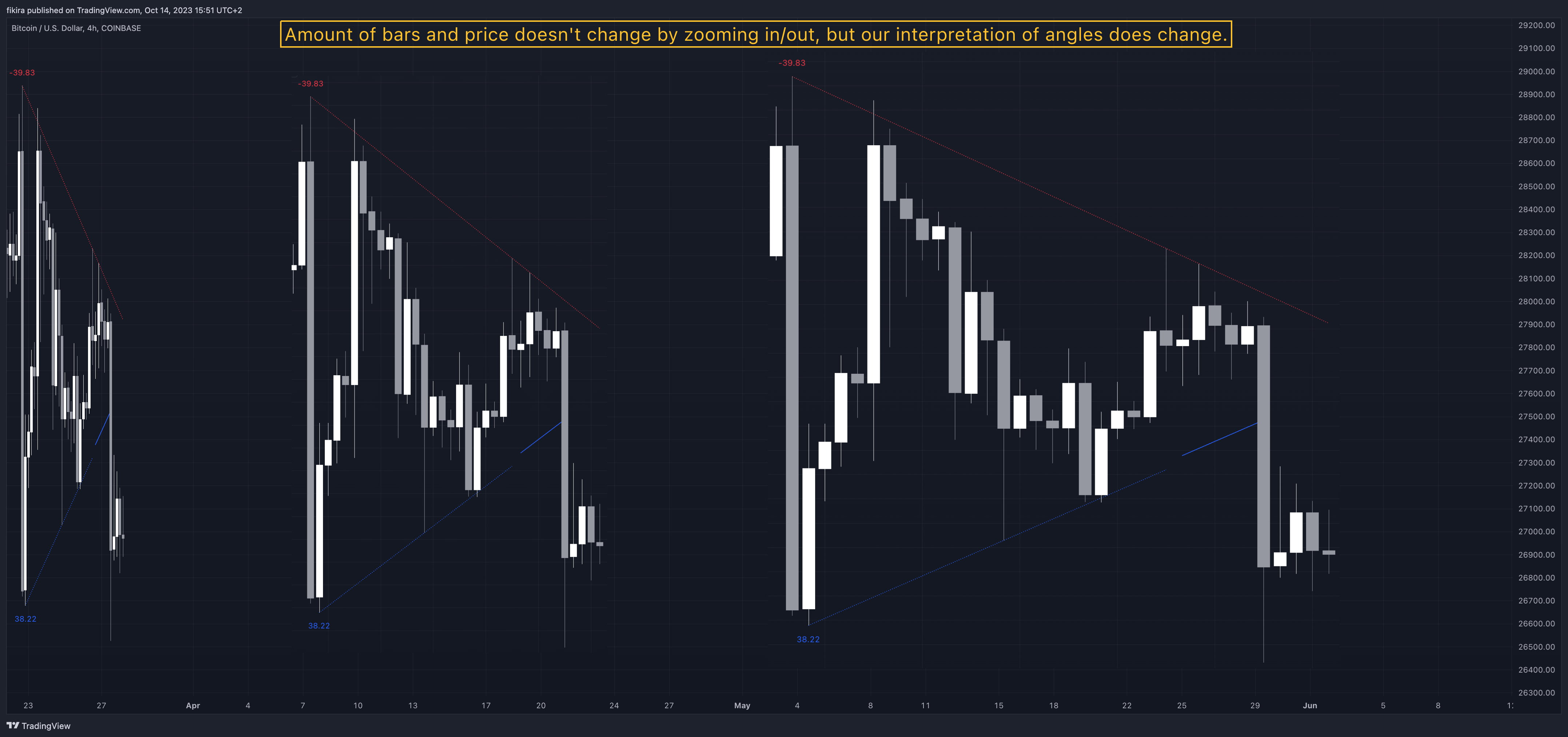 زاویهها معمولاً باید زمانی محاسبه شوند که واحدهای محور X و Y یکسان باشند. با این حال، در نمودارهای ما، واحد محور X، بارها (Bars) و واحد محور Y، قیمت (Price) است. بنابراین، محاسبه زاویههای معتبر کار سادهای نیست.