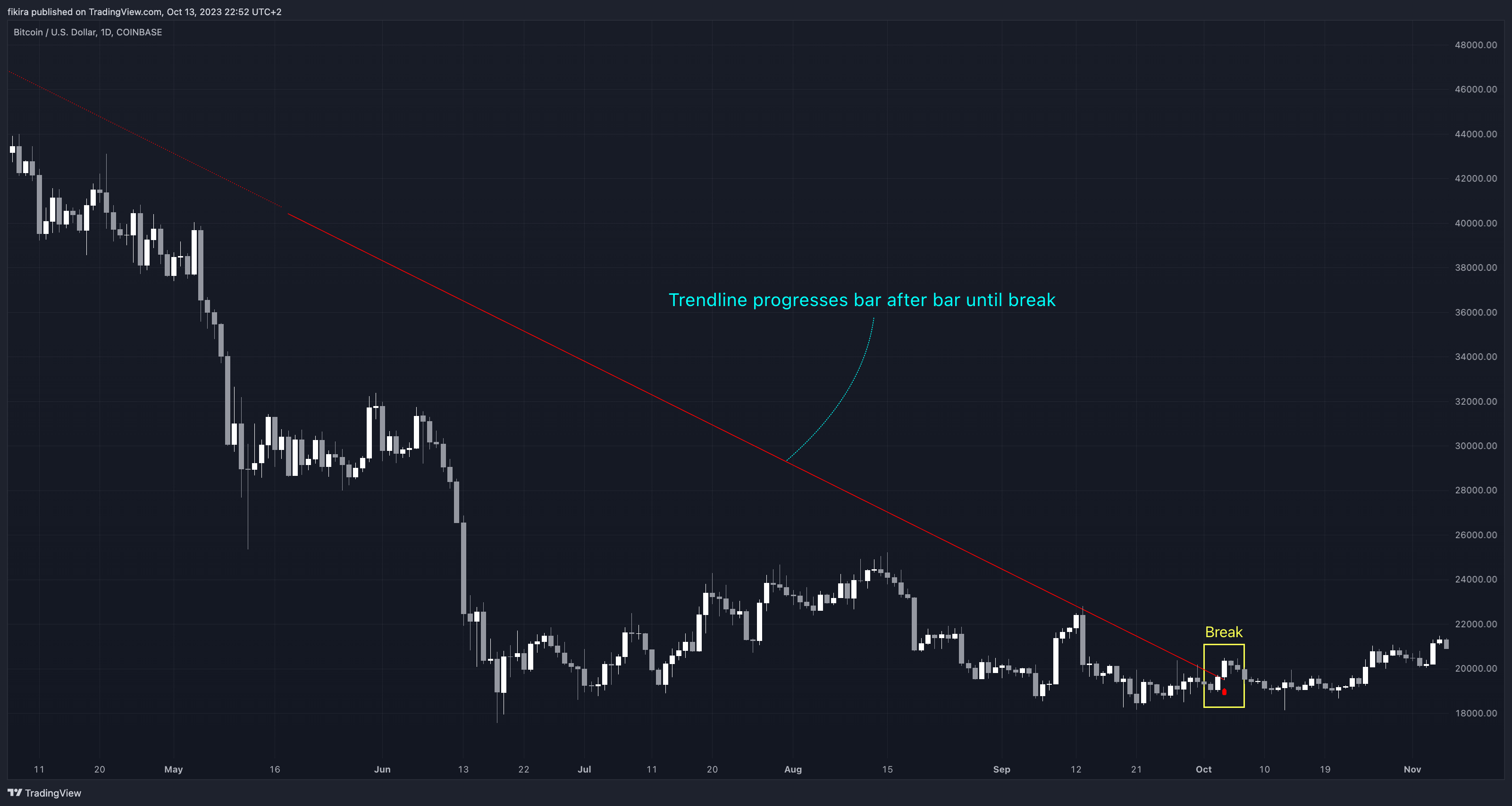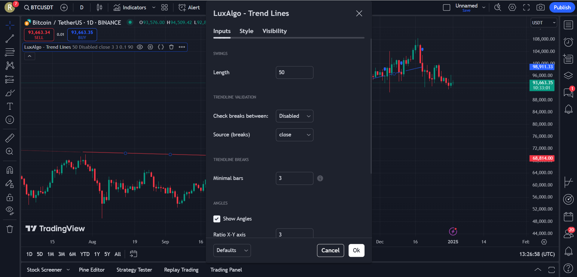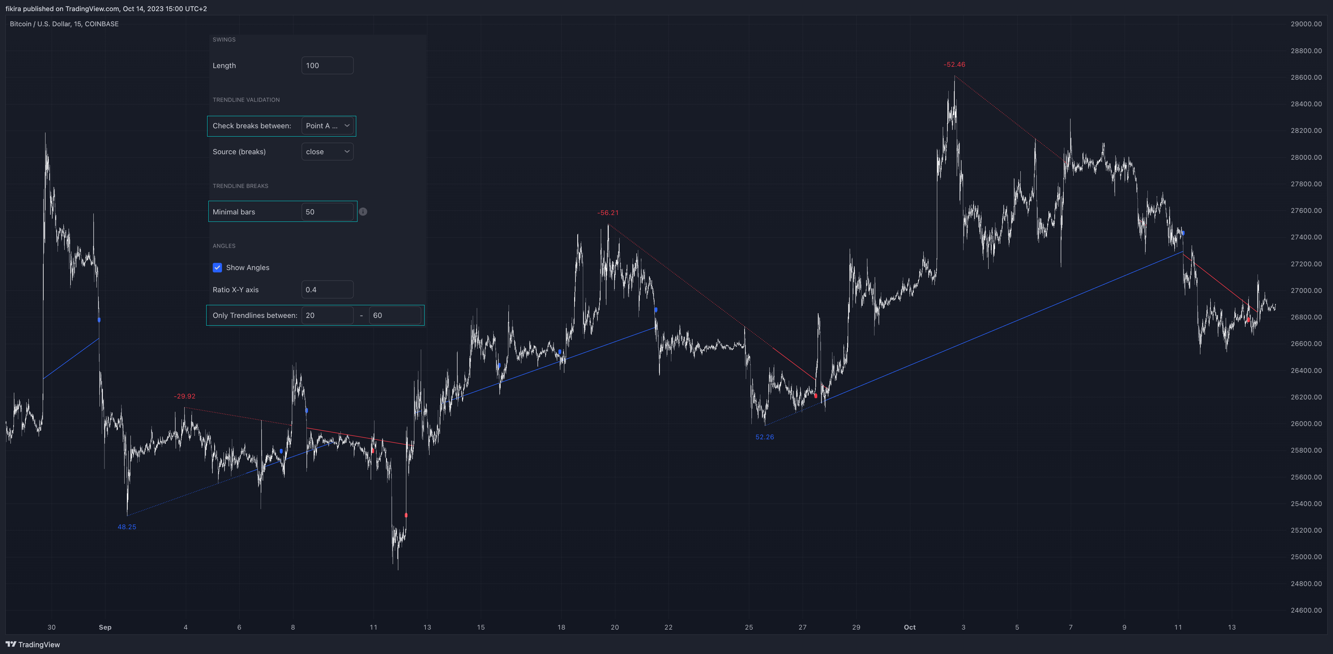 زمانی که یک خط روند شکسته شود، این اتفاق ممکن است نشانگر احتمال تغییر روند باشد. این اندیکاتور با برچسبگذاری شکستها، نقاط شکست را برجسته میکند. علاوه بر این، کاربران میتوانند خطوط روند را بر اساس زاویههای مشخصشده فیلتر کنند و تنها خطوطی را نمایش دهند که زاویههای آنها در محدوده مشخصشده توسط کاربر قرار دارد. این ویژگی به کاهش شلوغی نمودار کمک میکند و در عین حال خطوط روند با شیب بیشتر یا افقیتر را نیز در اختیار کاربر قرار میدهد.