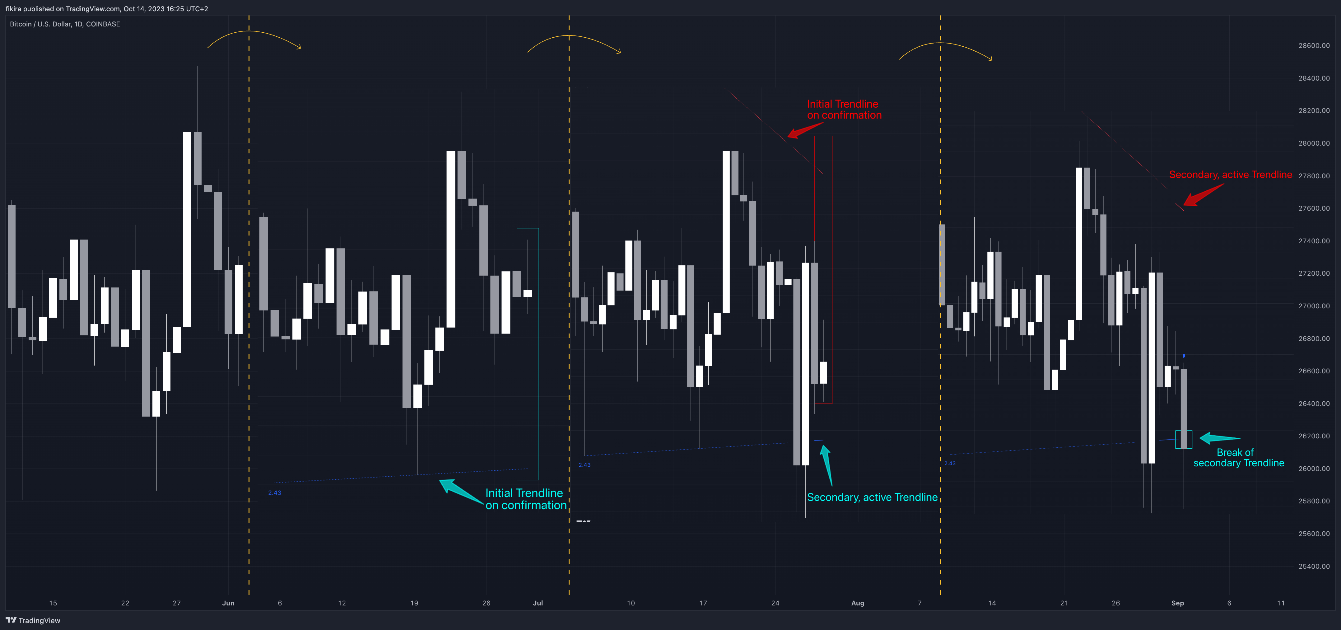 همانطور که ذکر شد، خط روند دوم (خط ضخیم) به صورت مداوم کندل به کندل پیش میرود تا زمانی که: