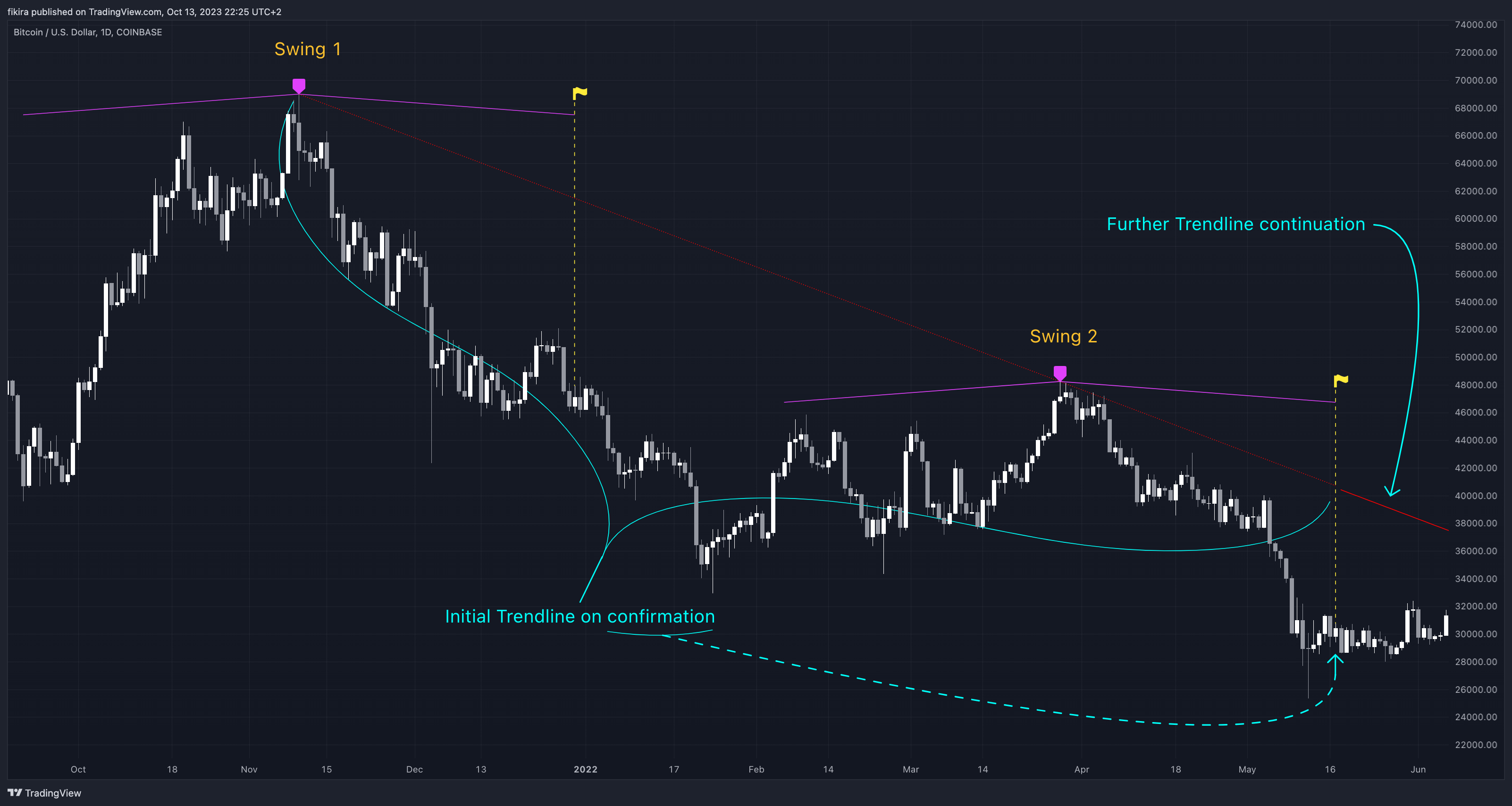 هنگامی که یک سوئینگ (نقطه محوری) شناسایی میشود، یک خط روند در شرایط خاصی رسم میگردد. یکی از شرایط اصلی این است که: