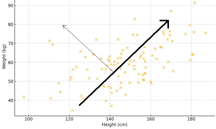 برای درک بهتر پاراگرافهای پیشین، یک نمودار پراکندگی را در نظر بگیرید که محور افقی وزن و محور عمودی قد یک نمونه از افراد را نشان میدهد. اگر خطی از میان نقاط بگذرد که با پراکندگی دادهها همخوانی داشته باشد، این خط الگوی اصلی را نمایش میدهد: افراد بلندتر معمولاً وزن بیشتری دارند. اکنون، یک بردار ویژه را مانند یک فلش در نظر بگیرید که به این جهت اصلی اشاره دارد و بزرگترین روند یا الگوی غالب را نشان میدهد. مقدار ویژه مرتبط نشاندهنده قدرت این پدیده است. اگر فلش دیگری عمود بر اولی رسم کنیم، الگوی ثانویه را نشان میدهد، مانند اینکه چگونه بعضی افراد نسبت به قد خود وزن بیشتری یا کمتری دارند.