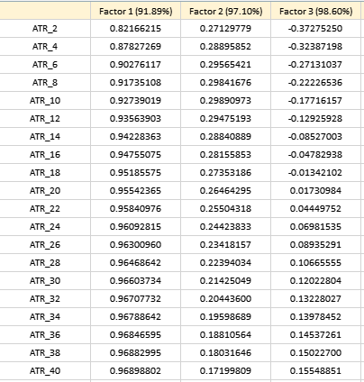 برای انجام تحلیلهای گسترده که نیاز به بررسی ماتریسهای بزرگ دارند، چاپ مستقیم این دادهها در تب “اکسپرتها”ی متاتریدر 5 به دلیل حجم بالای اطلاعات کافی نیست. هدف از این تحلیلها این است که کاملاً در محیط متاتریدر 5 انجام شود و نیازی به تغییر به سایر پلتفرمها مانند پایتون یا R نباشد. بنابراین، یک رابط کاربری گرافیکی برای پیادهسازی تحلیل فاکتور اصلی (PFA) اضافه شد. در اینجا، گرافیکی از مجموعه دادههای مورد استفاده در این مثال نمایش داده شده است که هر ستون شامل مقادیر شاخص برای یک بازه زمانی خاص است، مانند “ATR_2” که نمایانگر شاخص ATR با طول پنجره ۲ است.