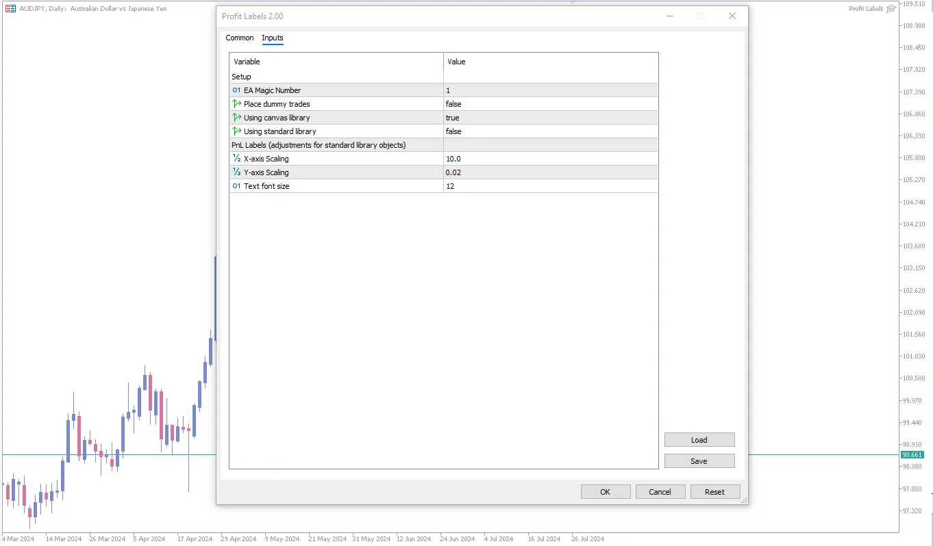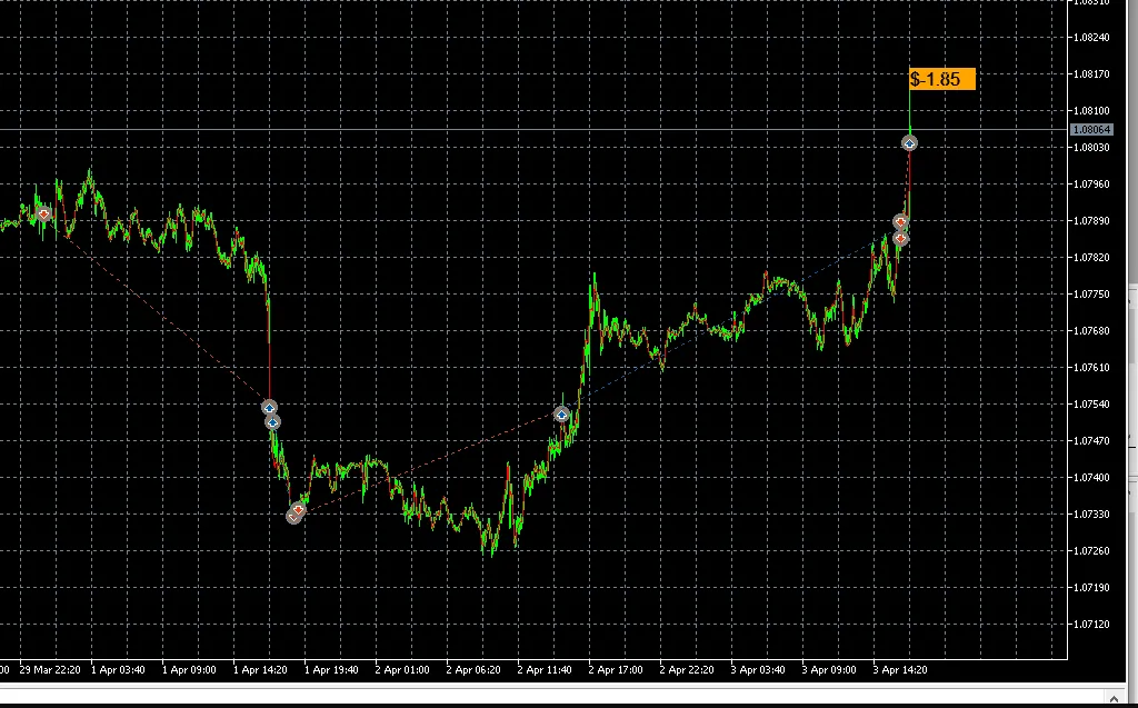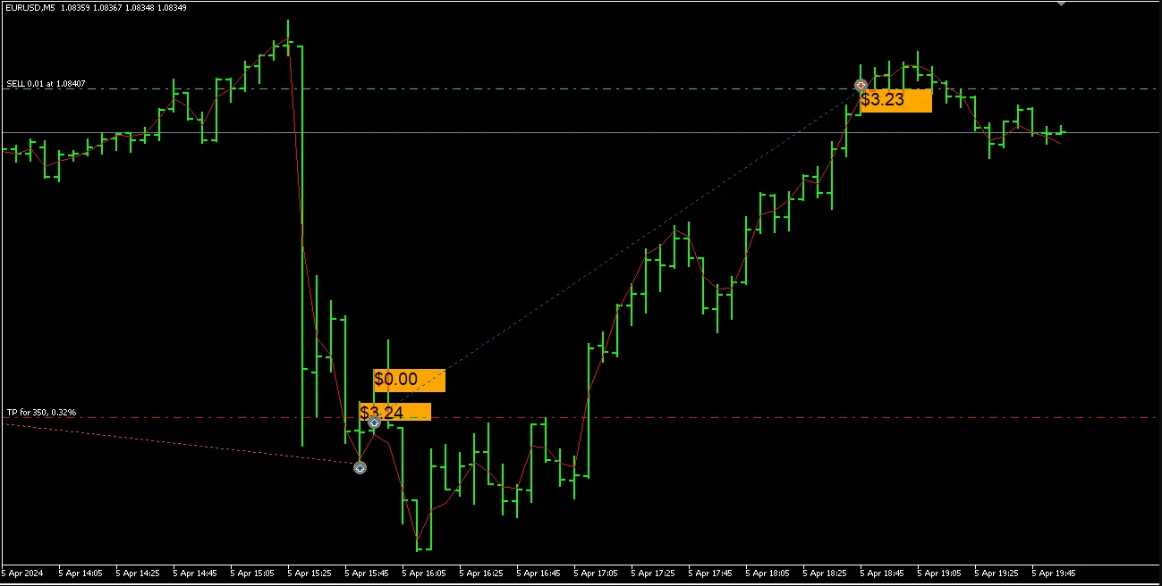 - 🧪 مشاهده: همانطور که اکسپرت به صورت خودکار معاملات آزمایشی را باز و بسته میکند، خواهید دید که چگونه برچسبهای سود (مثبتاً سبز رنگ) و زیان (معمولاً قرمز رنگ) به محض بسته شدن هر معامله، در کنار نقطه خروج آن تشکیل میشوند. این برچسبها مقدار سود/زیان را به صورت پولی یا پیپ نشان میدهند.