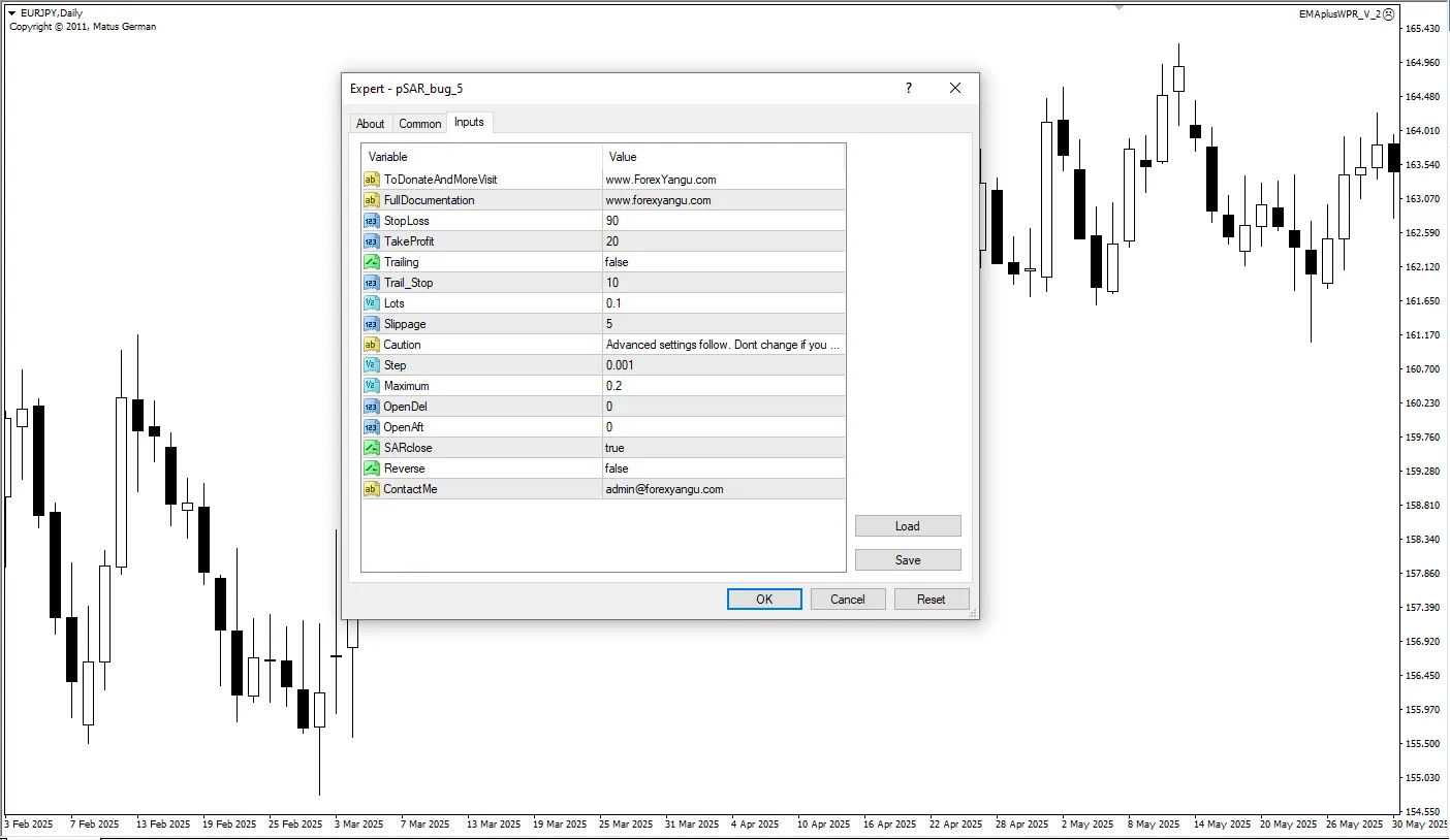 📍 برای هماهنگی دقیق: مقادیر Step و Maximum در اندیکاتور Parabolic SAR را طوری تنظیم کنید که با مقادیر داخل اکسپرت یکسان باشند.