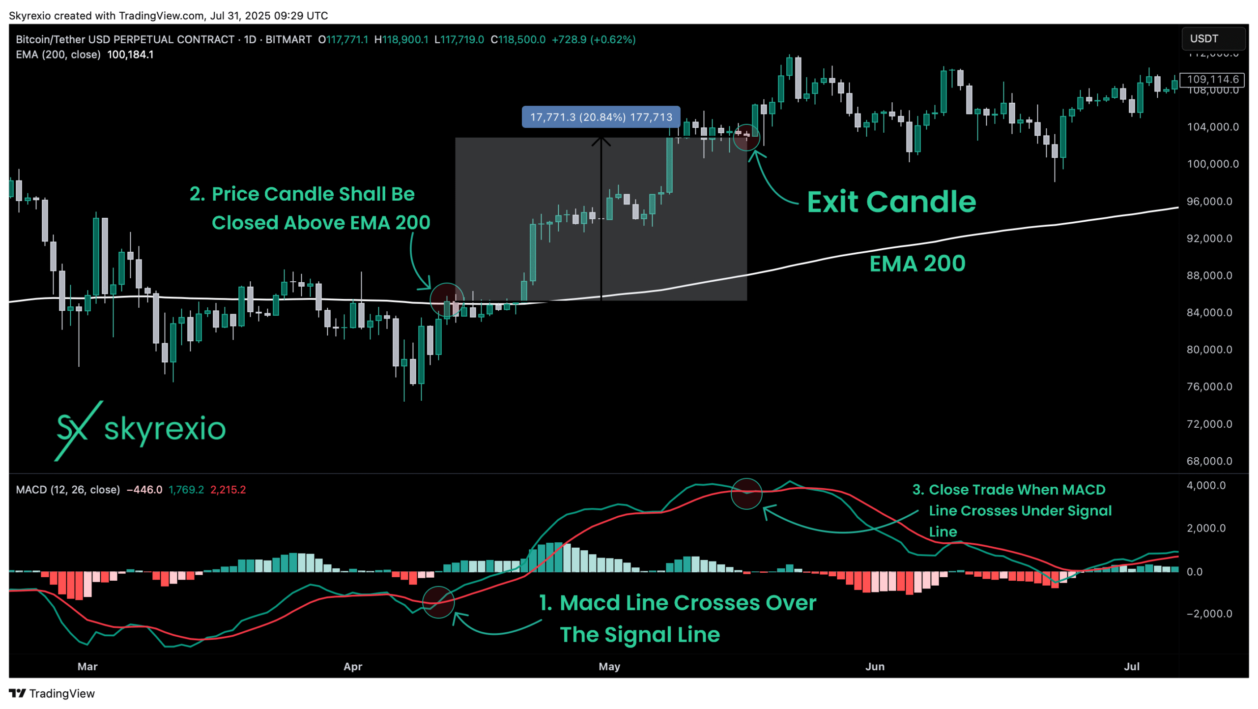 سیگنال خرید: هیستوگرام MACD از خط صفر به سمت بالا عبور میکند (تغییر مومنتوم از نزولی به صعودی) قیمت بالاتر از میانگین متحرک نمایی بلندمدت بسته میشود؛ در اینجا از EMA با دوره ۲۰۰ استفاده میکنیم.