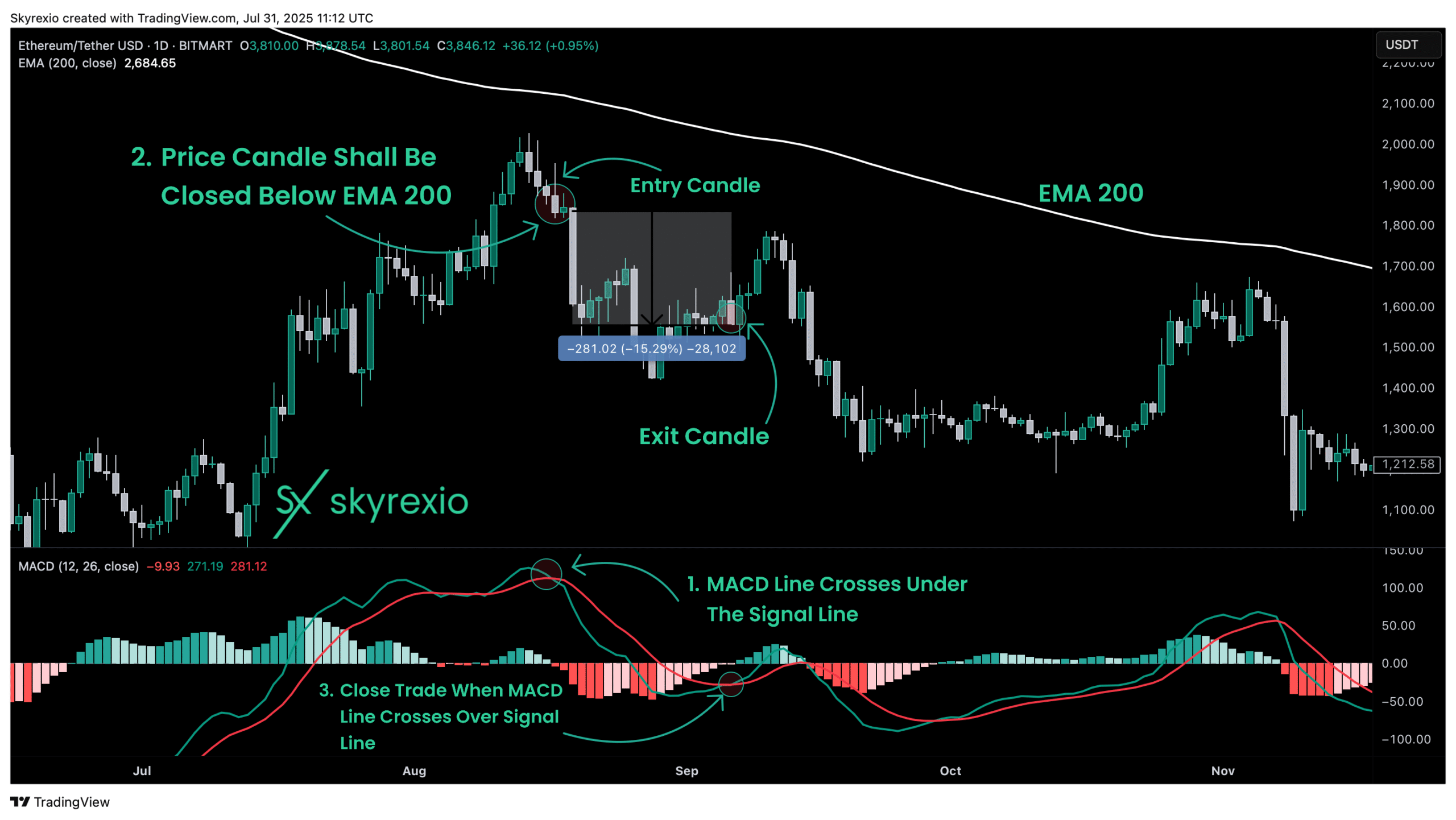 صبر کنید تا خط MACD از بالا به پایین، خط سیگنال را قطع کند. در مثال ما از تایمفریم روزانه (1D) برای جفتارز ETHUSDT استفاده شده است. اگر شرط دوم نیز برقرار بود، وارد معامله فروش شوید.