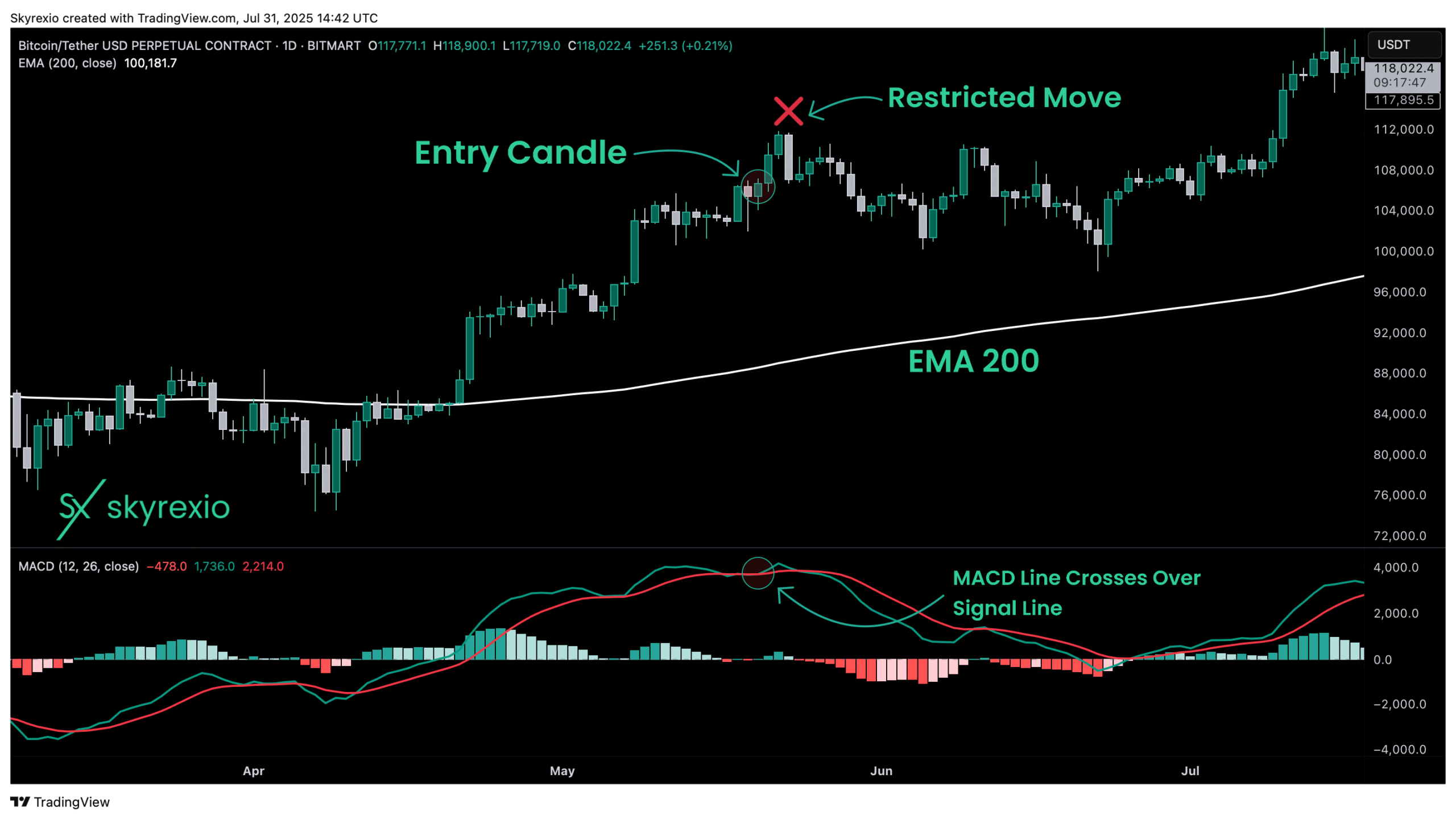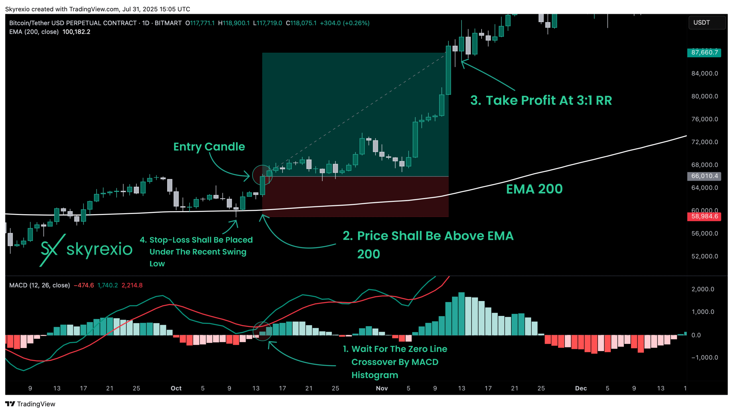 سیگنال خرید: هیستوگرام MACD از خط صفر به سمت بالا عبور میکند (تغییر مومنتوم از نزولی به صعودی) قیمت بالاتر از میانگین متحرک نمایی بلندمدت بسته میشود؛ در اینجا از EMA با دوره ۲۰۰ استفاده میکنیم.