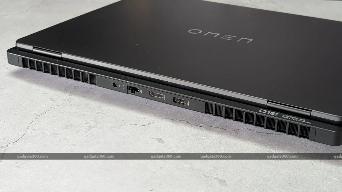 در مورد درگاهها، HP Omen Max 16 گزینههای مناسب و متنوعی ارائه میدهد — چیزی که واقعاً به آن اهمیت میدهم. در قسمت پشت دستگاه، ورودی برق DC، یک خروجی HDMI 2.1، یک پورت اترنت RJ-45 و یک درگاه USB Type-A 3.2 نسل اول قرار دارد. قرار گرفتن این درگاههای مهم در پشت، به شما کمک میکند تا در هنگام استفاده از لپتاپ به صورت ایستاده (Docked)، محیط کاری مرتب و بدون سیمهای اضافی داشته باشید.