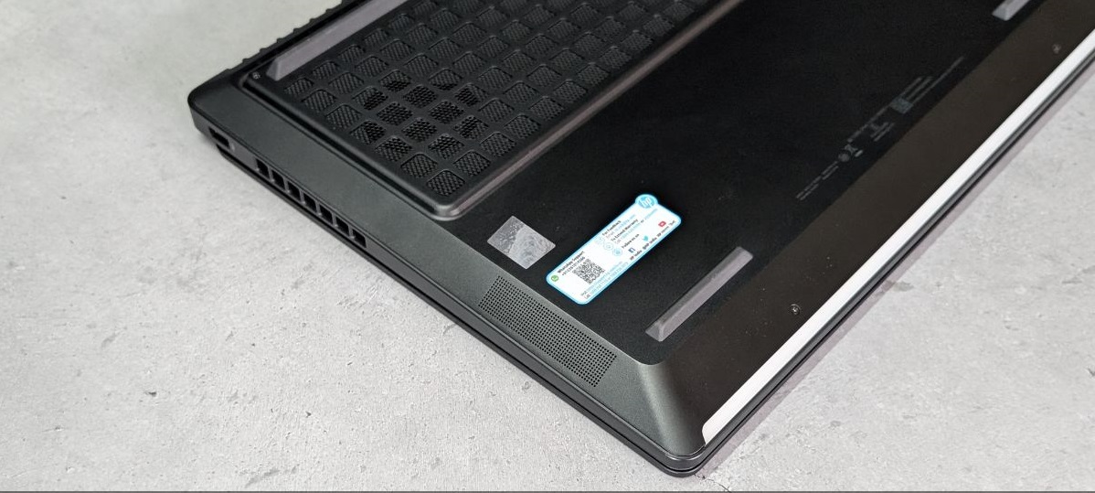 سیستم خنککننده نیز به خوبی در نظر گرفته شده است؛ درگاههای ورود هوای خنک در دو طرف دستگاه وجود دارند و درگاههای خروج هوای گرم نیز در پشت قرار گرفتهاند. وقتی لپتاپ را برعکس میکنید، یک پنل مشبک بزرگ را مشاهده میکنید که تقریباً نیمی از قسمت پایینی را پوشانده و به بهبود جریان هوا کمک میکند. چهار پایه لاستیکی شامل دو عدد کوتاه در جلو و یک عدد بلندتر در پشت دستگاه، بدنه را کمی بالاتر از سطح قرار گیری میبرند و به تهویه بهتر کمک میکنند. لبههای زاویهدار پایینی حاوی دریچههای بلندگوهای پایینسو هستند.