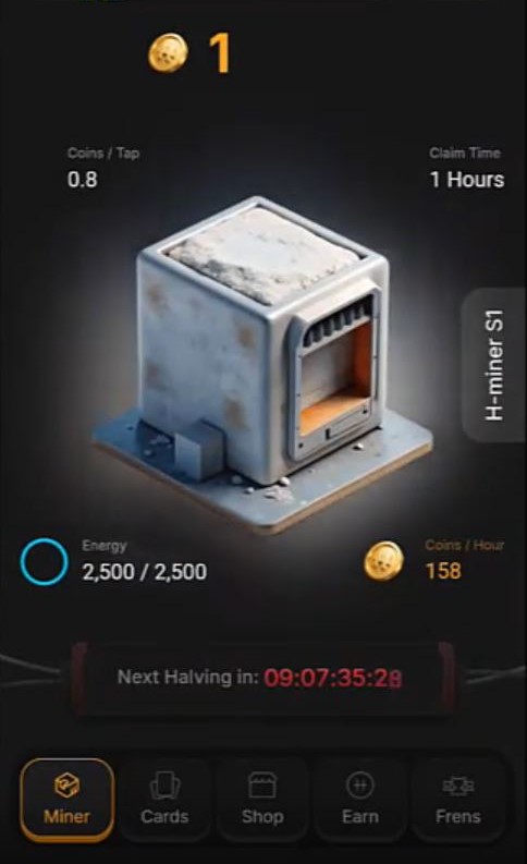 ماینرها نقش کلیدی در بازی Hashcats دارند. در صفحه اصلی، ماینر شما با جزئیات کامل قابل مشاهده است. به عنوان مثال، ماینر سطح ۱ با نام H-Miner S1 میتواند در هر ساعت مقدار مشخصی سکه استخراج کند. میزان انرژی موجود، زمان باقیمانده تا ادعای سکههای استخراجشده و نرخ استخراج در هر ساعت به وضوح در این بخش نمایش داده میشود.