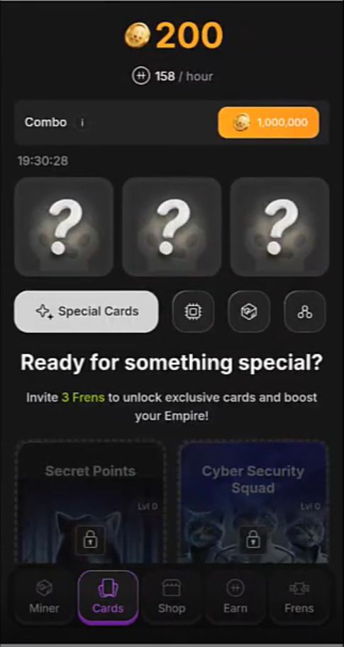 در بخش Cards بازی، مجموعهای از کارتهای قابل ارتقاء وجود دارد که با استفاده از آنها میتوانید سرعت و توان استخراج خود را بهبود دهید. برخی از این کارتها به عنوان کارتهای کمبو روزانه شناخته میشوند که با فعالسازی آنها میتوانید پاداشهای ویژهای دریافت کنید.