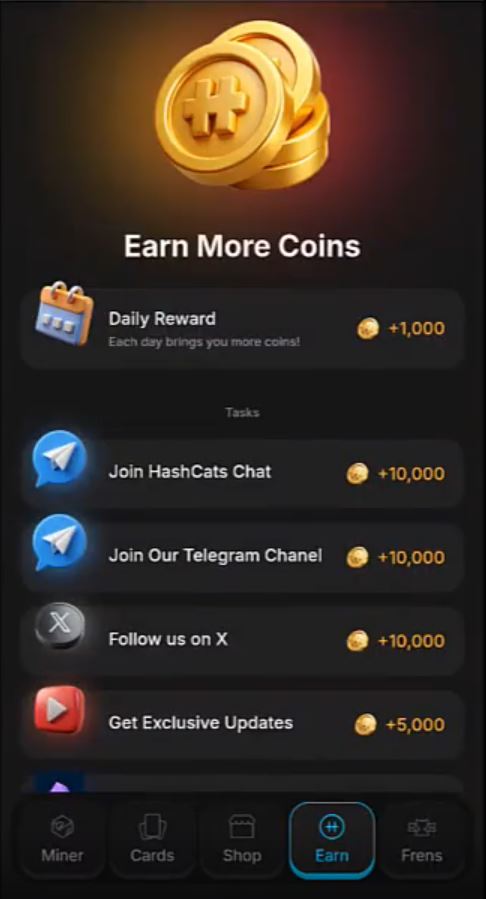 بخش Earn در بازی Hashcats راهی عالی برای افزایش سریع داراییها است. بازیکنان میتوانند با انجام وظایف سادهای مانند دریافت پاداش روزانه، عضویت در چت تلگرام، دنبال کردن حساب رسمی بازی در X (توییتر سابق) و مشارکت در کانال تلگرام، سکههای بیشتری به دست آورند.