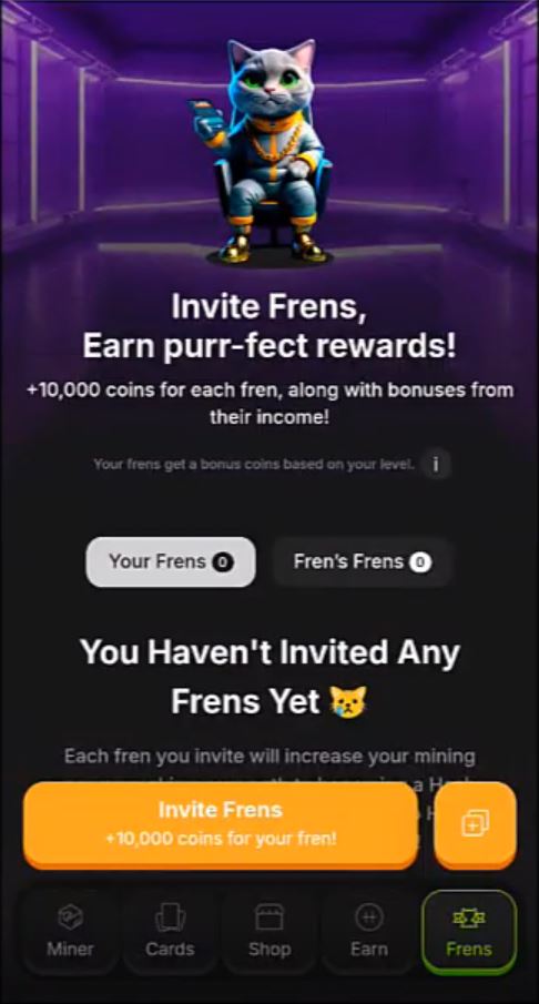 یکی از جذابترین امکانات بازی Hashcats، بخش Frens است که به شما امکان میدهد دوستان خود را دعوت کرده و پاداشهای ویژهای دریافت کنید. برای هر دوستی که دعوت میکنید، ۱۰,۰۰۰ سکه به عنوان پاداش دریافت خواهید کرد.