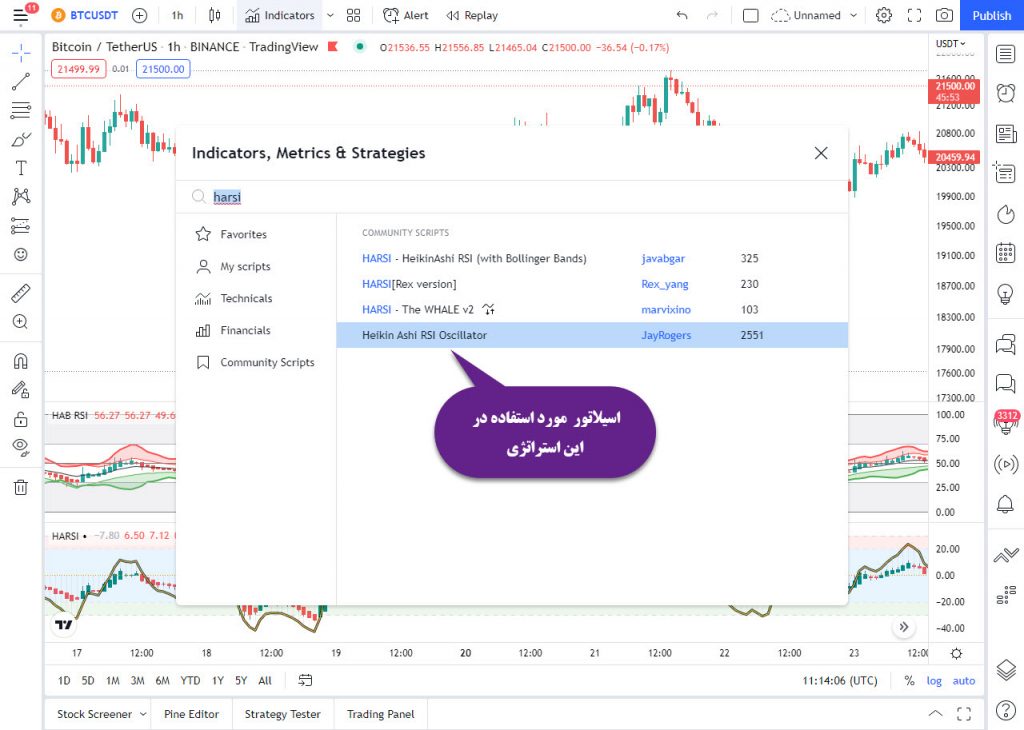 برای قرار دادن اندیکاتور HARSI طبق تصویر زیر عمل کنید نام کامل این اندیکاتور Heikin Ashi RSI Oscillator می باشد که ترکیبی از چندین اندیکاتور می باشد
