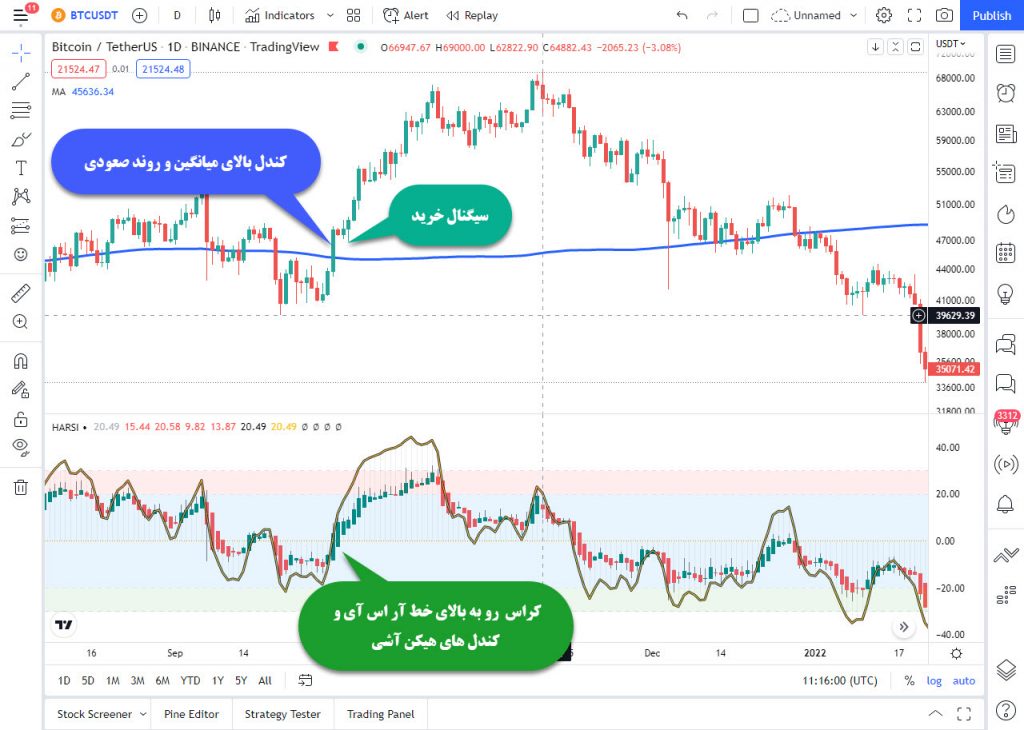 ما در این استراتژی ابتدا روند را با اندیکاتور میانگین متحرک تشخیص می دهیم و سپس با اندیکاتور HARSI سیگنال را دریافت می کنیم.