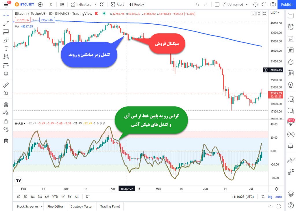 سیگنال فروش استراتژی ارز دیجیتال با اندیکاتور هیکن آشی و آر اس آی