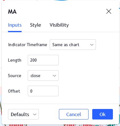 برای استفاده از این اندیکاتور فقط باید دوره یا پریود آن روی 200 تنظیم شود و باقی موارد مانند تصویر زیر تنظیم گردد.