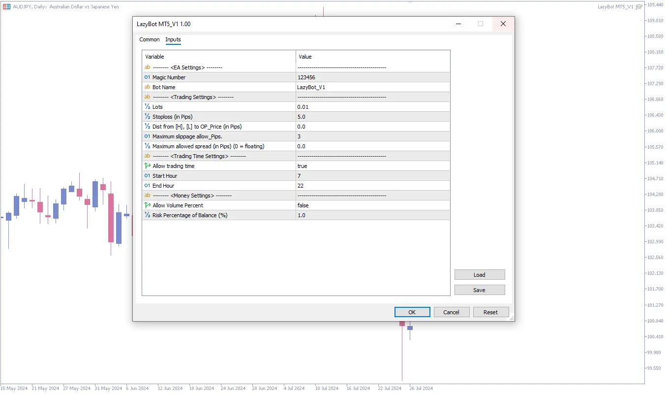 //Import External class #include <Trade\PositionInfo.mqh> #include <Trade\Trade.mqh> #include <Trade\SymbolInfo.mqh> #include <Trade\AccountInfo.mqh> #include <Trade\OrderInfo.mqh> //--- introduce predefined variables for code readability #define Ask SymbolInfoDouble(_Symbol, SYMBOL_ASK) #define Bid SymbolInfoDouble(_Symbol, SYMBOL_BID) //--- input parameters input string EASettings = "---------------------------------------------"; //-------- <EA Settings> -------- input int InpMagicNumber = 123456; //Magic Number input string InpBotName = "LazyBot_V1"; //Bot Name input string TradingSettings = "---------------------------------------------"; //-------- <Trading Settings> -------- input double Inpuser_lot = 0.01; //Lots input double Inpuser_SL = 5.0; //Stoploss (in Pips) input double InpAddPrice_pip = 0; //Dist from [H], [L] to OP_Price (in Pips) input int Inpuser_SLippage = 3; // Maximum slippage allow_Pips. input double InpMax_spread = 0; //Maximum allowed spread (in Pips) (0 = floating) input string TimeSettings = "---------------------------------------------"; //-------- <Trading Time Settings> -------- input bool isTradingTime = true; //Allow trading time input int InpStartHour = 7; //Start Hour input int InpEndHour = 22; //End Hour input string MoneyManagementSettings = "---------------------------------------------"; //-------- <Money Settings> -------- input bool isVolume_Percent = false; //Allow Volume Percent input double InpRisk = 1; //Risk Percentage of Balance (%)