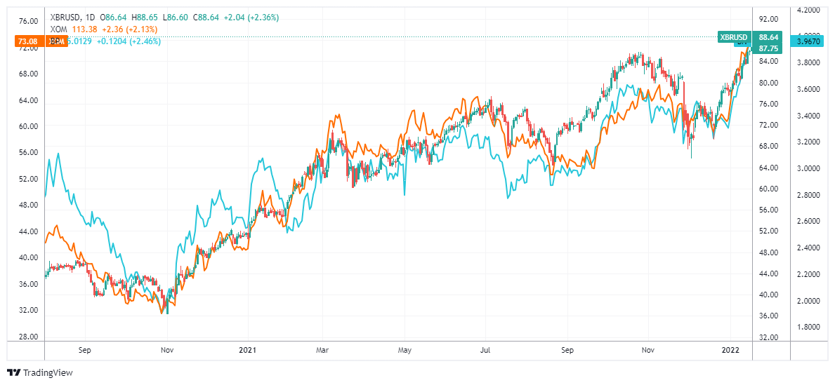 مزیت تحلیل بینبازاری دیدگاه جامع آن نسبت به دینامیکهای بازار است، اما همچنین نیازمند درک قوی از اقتصاد جهانی است. بهعنوان مثال، در نمودار بالا میتوان قیمت نفت خام را با قیمتهای Exxon Mobil (XOM) و BP (BP) که روی هم قرار گرفتهاند مشاهده کرد. همبستگی قوی بین روند قیمت نفت خام و روند قیمت سهام این شرکتها وجود دارد. معاملهگران میتوانند با ارزیابی خوشبینی یا بدبینی بازار نسبت به نفت خام، جهتگیری آینده XOM و BP را تعیین کنند.