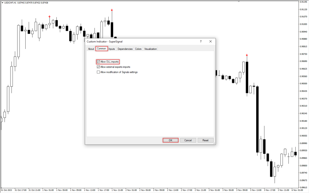 زمانی که اندیکاتور را بر روی چارت رسم می کنید در اولین صفحه ایی که بر روی چارت باز می شود گزینه ی Allow DLL را فعال کنید و سپس بر روی گزینه ی OK کلیک نمایید.