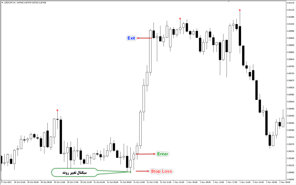 2- سیگنال تغییر روند توسط فلش قرمز رنگ رو به پایین صادر می شود و نشانه موقعیت فروش می باشد.