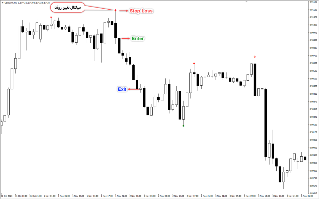 3- ابتدا سیگنال تغییر روند را با استفاده از شاخص های فنی دیگر تایید کنید ، پس از تایید از کندل تثبیت شده سیگنال وارد پوزیشن فروش شوید.