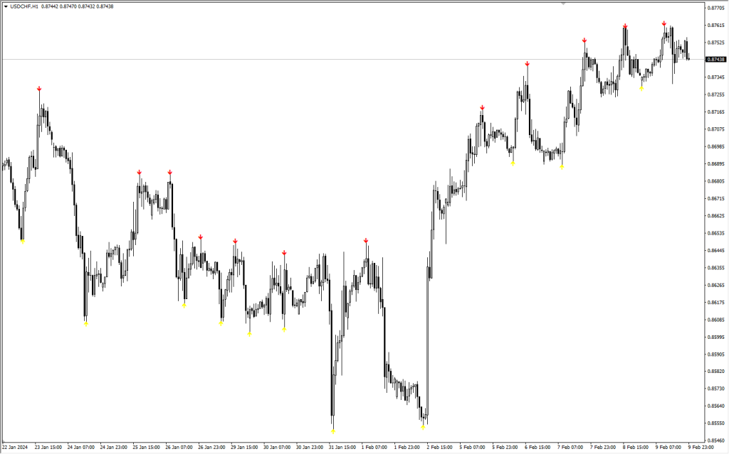 همچنین اندیکاتور ، زمانی که بر روی نمودار قیمتی یک تغییر روند نزولی را شناسایی کند با استفاده از فلش قرمز رنگ بر روی نمودار قیمتی نقطه تغییر روند را مشخص می کند و یک آلارم بر روی متاتریدر شما صادر می کند.