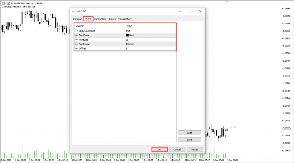 تنظیمات اندیکاتور B Clock برای متاتریدر 5