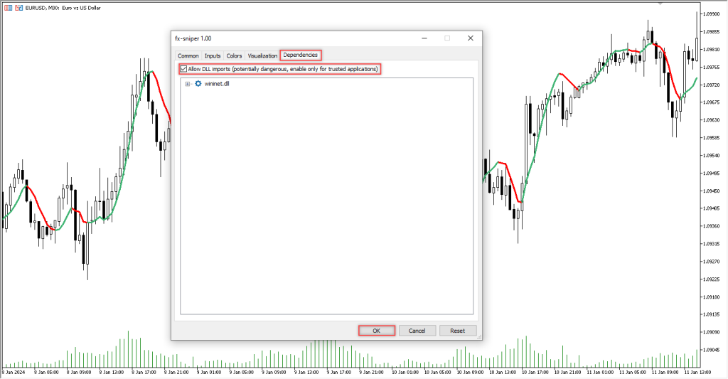 زمانی که اندیکاتور را بر روی چارت رسم می کنید در اولین صفحه ایی که بر روی چارت باز می شود گزینه ی Allow DLL را فعال کنید و سپس بر روی گزینه ی OK کلیک نمایید.