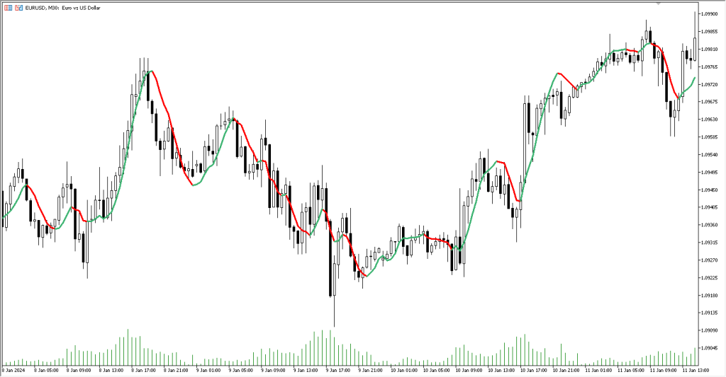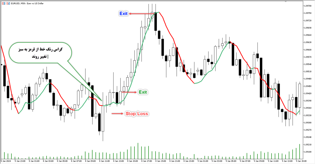 همانطور که به آن اشاره شد ، این اندیکاتور نقاط تغییر روند را نیز شناسایی می کند ، این نقاط تغییر روند توسط کراس رنگ خط اندیکاتور مشخص و شناسایی می شود ، به این صورت که کراس رنگ قرمز به سبز نشان دهنده تغییر روند صعودی است و کراس رنگ سبز به قرمز نشان دهنده تغییر روند نزولی می باشد.