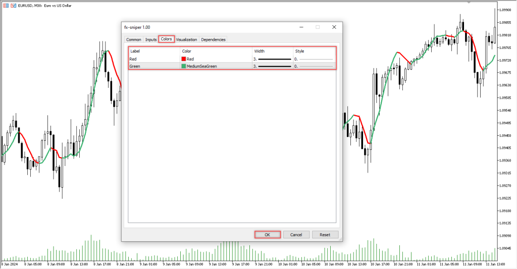 در سربرگ Color نیز ویژگی ظاهری اندیکاتور وجود دارد که میتوانید آنها را به صورت دلخواه تغییر دهید .