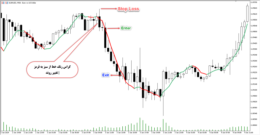 3- منتظر موقعیت بمانید تا رنگ خط اندیکاتور از سبز به قرمز کراس کند و تغییر جهت دهد.