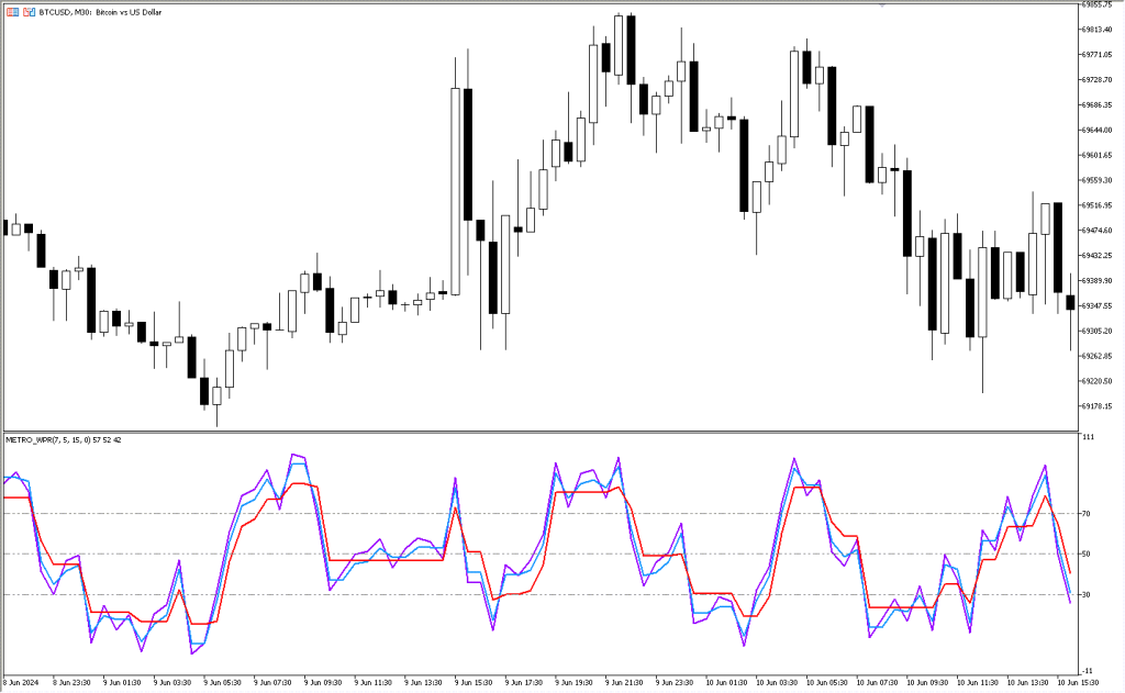 اندیکاتور Metro WPR یک نشانگر فنی است که دامنه نوسان گر ویلیام را در 3 خط با دوره های مختلف در تایم فریم فعلی بر روی نمودار قیمتی نشان می دهد ، Metro WPR نواحی اشباع خرید و اشباع فروش را به خوبی شناسایی می کند و به تصویر می کشد ، در پنجره اسیلاتور خود 3 لول 30، 50 و 70 تشکیل داده است که لول 30 به عنوان ناحیه اشباع فروش و لول 70 به عنوان ناحیه اشباع خرید در نظر گرفته می شود.