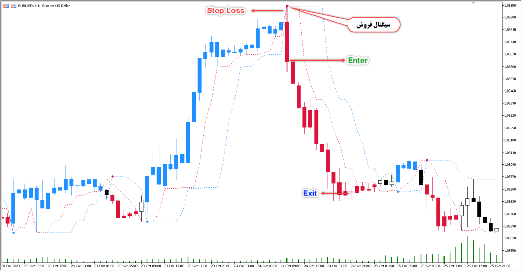 5- سیگنال فروش را با استفاده از شاخص های فنی و اندیکاتور های دیگر تایید کنید و پس از تایید ، از کندل تثبیت وارد پوزیشن Sell شوید.