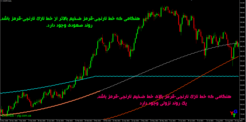 - دو خط نارنجی-قرمز روند بازار را نشان می دهد که صرفاً بالاتر از دیگری است. هنگامی که خط نازک نارنجی-قرمز بالای خط ضخیم نارنجی-قرمز باشد، یک روند نزولی وجود دارد. در مقابل، زمانی که خط نارنجی-قرمز ضخیم بالاتر از خط نازک نارنجی-قرمز باشد، روند صعودی وجود دارد. سپس خط آبی می آید که به عنوان خط سیگنال برای شکستگی عمل می کند.