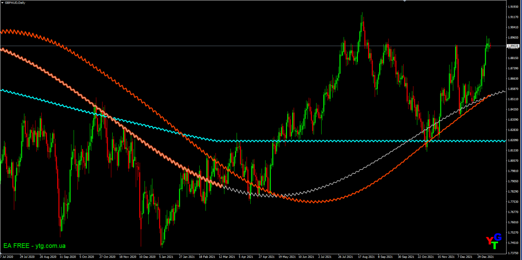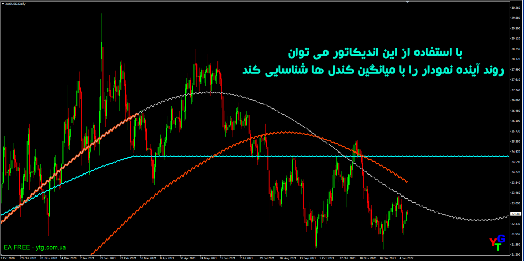 - اندیکاتور PanPrizMA Sin leverage 72 روند آینده نمودار با میانگین کندل ها را شناسایی می کند.