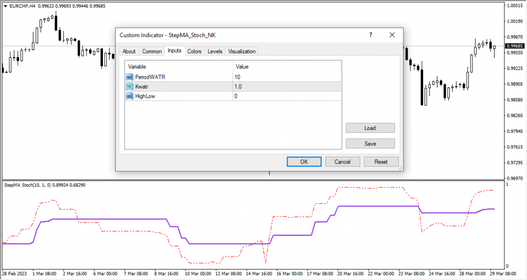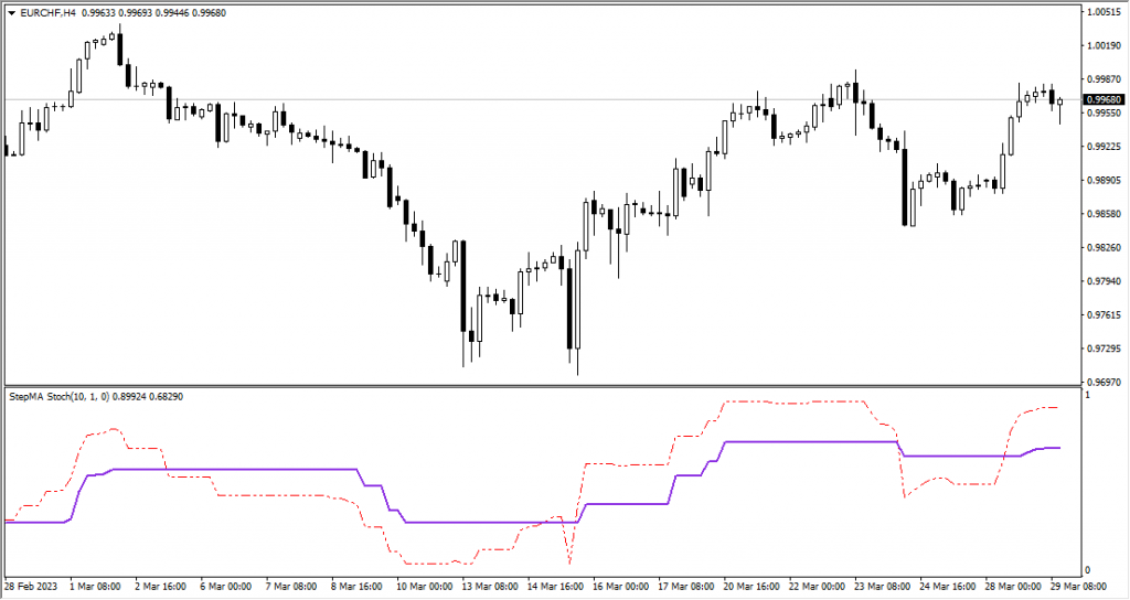 این اندیکاتور دو خط را ترسیم می کند که در محدوده صفر تا یک در نوسان هستند. خط اصلی Step MA یک خط نقطه چین قرمز است. سپس با یک خط سیگنال بنفش آبی جفت می شود.