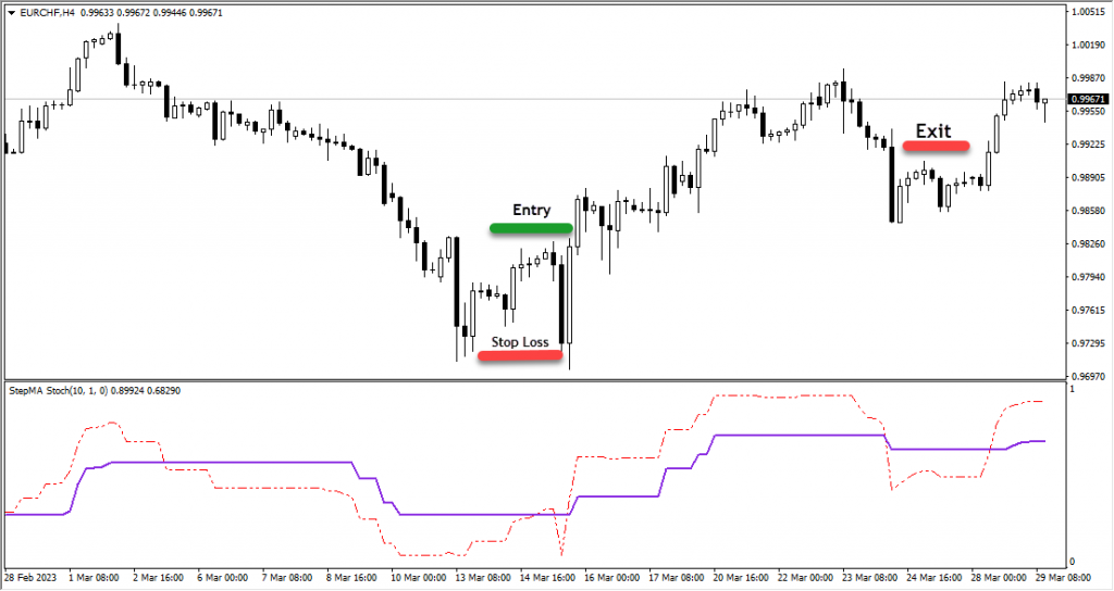 این اندیکاتور می تواند به عنوان یک نشانگر سیگنال تغییر روند بر اساس کراس دو خط استفاده شود. با این حال، بهتر است از آن به عنوان یک فیلتر جهت روند استفاده شود که در آن معامله‌گران فقط در جهتی که توسط Step MA Indicator نشان داده شده است معامله می‌کنند.