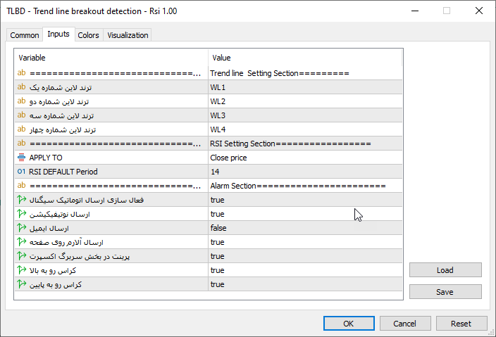 تنظیمات اندیکاتور تشخیص شکست خط روند در اندیکاتور RSI
