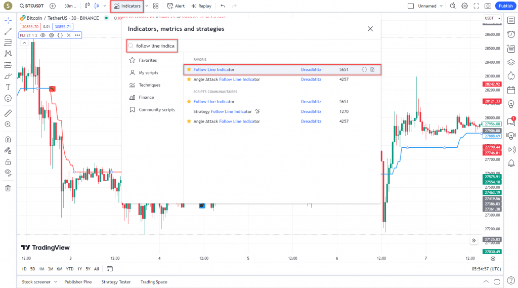 مطابق با تصویر درج شده پایین در صفحه تریدینگ ویو به قسمت سرچ اندیکاتور بروید و کلمه ی ” Follow Line Indicator ” را سرچ کرده و بر روی اندیکاتور Follow Line Indicator کلیک کنید تا اندیکاتور انتخاب و بر روی چارت شما اجرا شود .