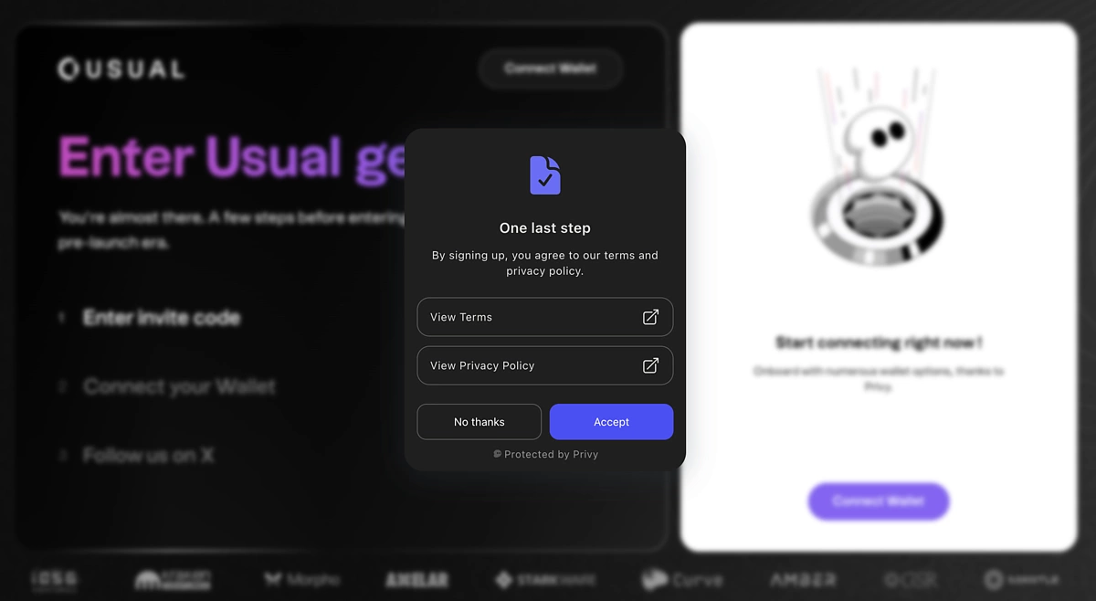 به وبسایت (https://app.usual.money/) بروید و کد دعوت زودهنگام خود را وارد کنید. اگر دوستانی در Usual ندارید، میتوانید از صفحه رسمی X آنها یا کانالهای Discord و Telegram آنها برای مشاهده کدهایی که دیگر کاربران به اشتراک میگذارند، استفاده کنید.