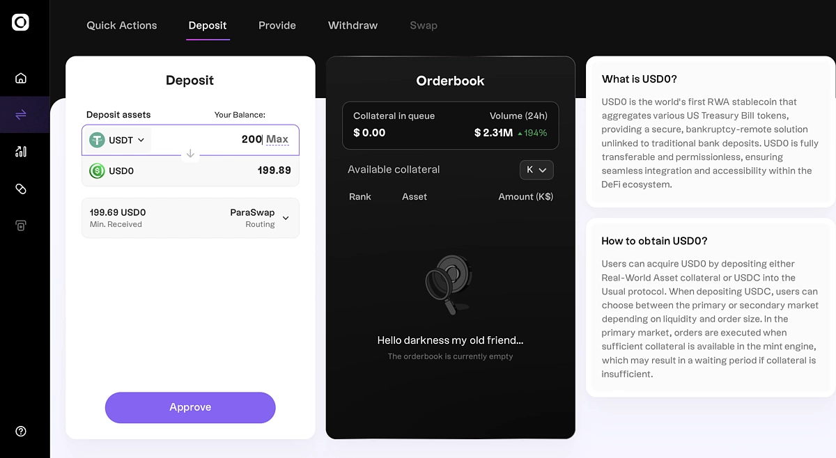 Usual یک پروتکل غیرمتمرکز است که به اتصال امور مالی سنتی به امور مالی غیرمتمرکز از طریق توکنیزه کردن داراییهای واقعی (RWAs) تمرکز دارد. این فرآیند با معرفی داراییهای ملموس مانند املاک و مستغلات، کالاها، و ابزارهای مالی به اکوسیستم بلاکچین، فرصتهای بهبود نقدینگی و دسترسی را فراهم میآورد. Usual این کار را با تجمیع توکنهای مختلف اوراق قرضه خزانهداری ایالات متحده از نهادهایی مانند BlackRock، Ondo، M0، Mountain Protocol، و Hashnote انجام میدهد که سپس به یک استیبل کوین بدون نیاز به مجوز و قابل تأیید بر روی زنجیره به نام USD0 تبدیل میشود.